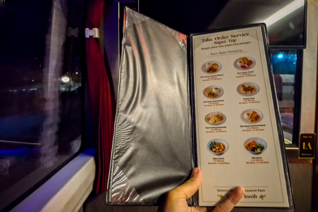 Mbak Pramugari juga menyodorkan sebuah buku menu makanan yang bisa aku pilih nanti saat di Resto Rosin Pemalang. Untuk penumpang kelas Super Top, menu makannya sudah ditentukan di awal. Sementara untuk penumpang kelas Eksekutif mendapatkan fasilitas makanan prasamanan. Kali ini aku memilih nasi goreng saja.