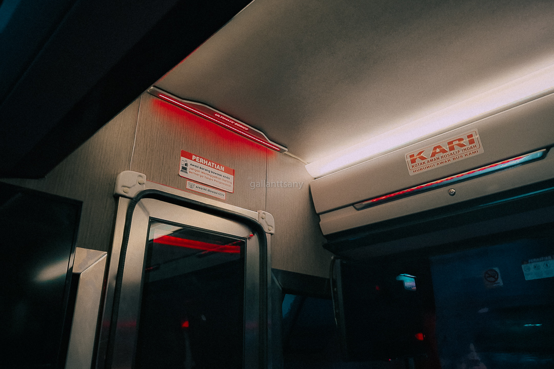 Bus Rosalia Indah dengan kode lambung 2008 tiba. Bus ini memiliki dua kelas di dalamnya, yaitu Super Top dengan konfigurasi kursi 2-1 berjumlah 6 kursi, dan Eksekutif Plus dengan konfigurasi kursi 2-2 berjumlah 24 kursi. Di dalam bus terdapat dua buah sekat. Sekat pertama antara kru dan kelas Super Top. Sekat kedua antara kelas Super Top dan kelas Eksekutif. Aku memilih untuk duduk di kelas Super Top, di kursi 1A alias paling depan sebelah kiri.