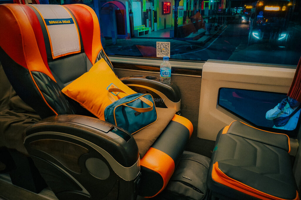 Bus Rosin tidak berhenti lama dan langsung berangkat begitu seluruh penumpang dari Jombor naik. Aku langsung duduk di kursiku, di nomor 1A. Kursi single seat ini berasal dari pabrikan Rimba Kencana. Berukuran cukup besar yang bisa direbahkan (reclining seat) dan ditambah dengan penopang kaki (footrest) terpisah. Terdapat meja lipat tersembunyi, colokan listrik, dan wadah botol atau gelas.