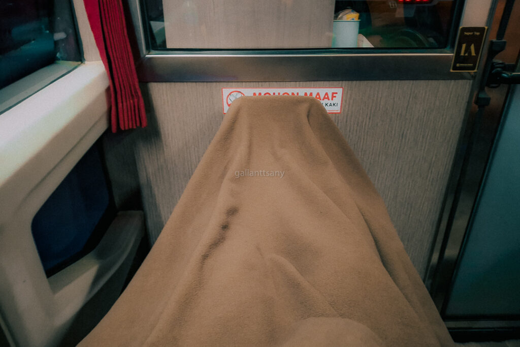 Di dalam bus juga terdapat dispenser dan beberapa minuman sachet yang bisa diseduh oleh penumpang. Dan seperti bus nonekonomi pada umumnya, bus Rosalia Indah dari Jogja ke Bandung ini sudah dilengkapi dengan pendingin ruangan dan toilet. Sudah terpasang bantal dan selimut yang masih bersih di atas kursi.